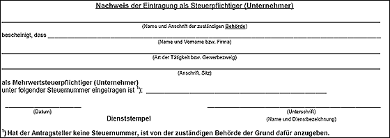 Der Unternehmer muss dem Bundeszentralamt für Steuern durch behördliche Bescheinigung des Staates, in dem der Unternehmer ansässig ist, nachweisen, dass er dort als Unternehmer unter einer Steuernummer eingetragen ist (§ 61 Absatz 3 UStDV). Diese Bescheinigung ist dem Bundeszentralamt für Steuern, Dienstsitz Schwedt, Passower Chaussee 3b, 16303 Schwedt/Oder, im Original zu übersenden. Die Bescheinigung muss in der Amtssprache eines Mitgliedstaates der EU ausgestellt sein und hat vom Tag der Ausstellung an ein Jahr Gültigkeit.